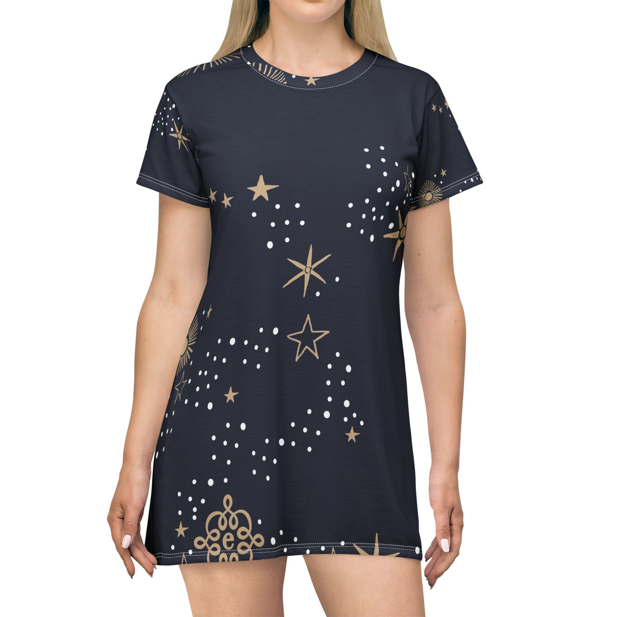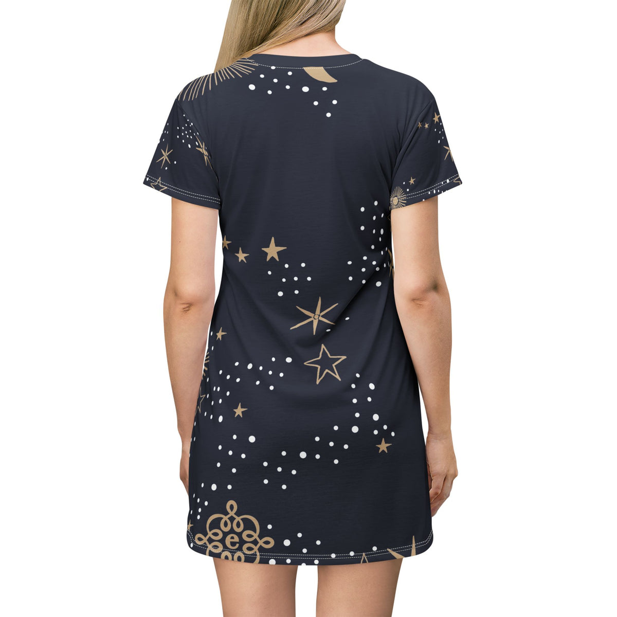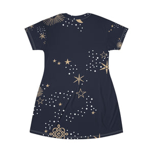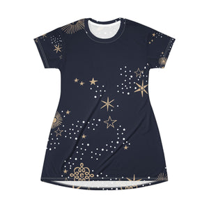 Starry Night T‑Shirt Dress — Navy Gold Celestial Print